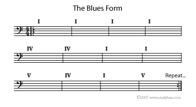 The structure of 12 bar blues goes as following (this example is in the key of E)