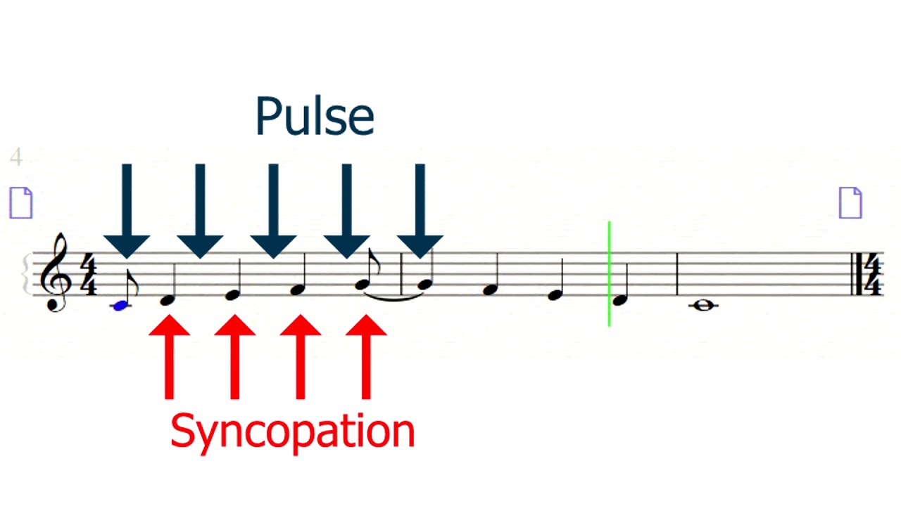 In this type of syncopation, notes tied over strong beats obscure the typical beat pattern. The example below shows a note tied over the bar line to displace the downbeat.